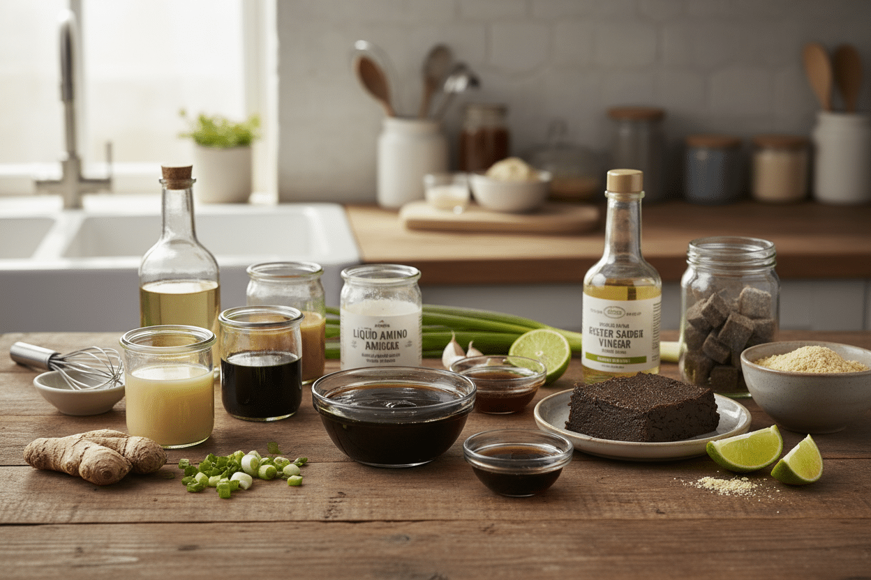 Les aminos de coco sont naturellement sans gluten et sans soja, ce qui en fait la solution la plus sûre pour les personnes doublement contraintes. Leur goût est légèrement différent, plus doux et moins fermenté, mais ils s'intègrent bien dans les woks, les marinades et les sauces asiatiques alternatives.